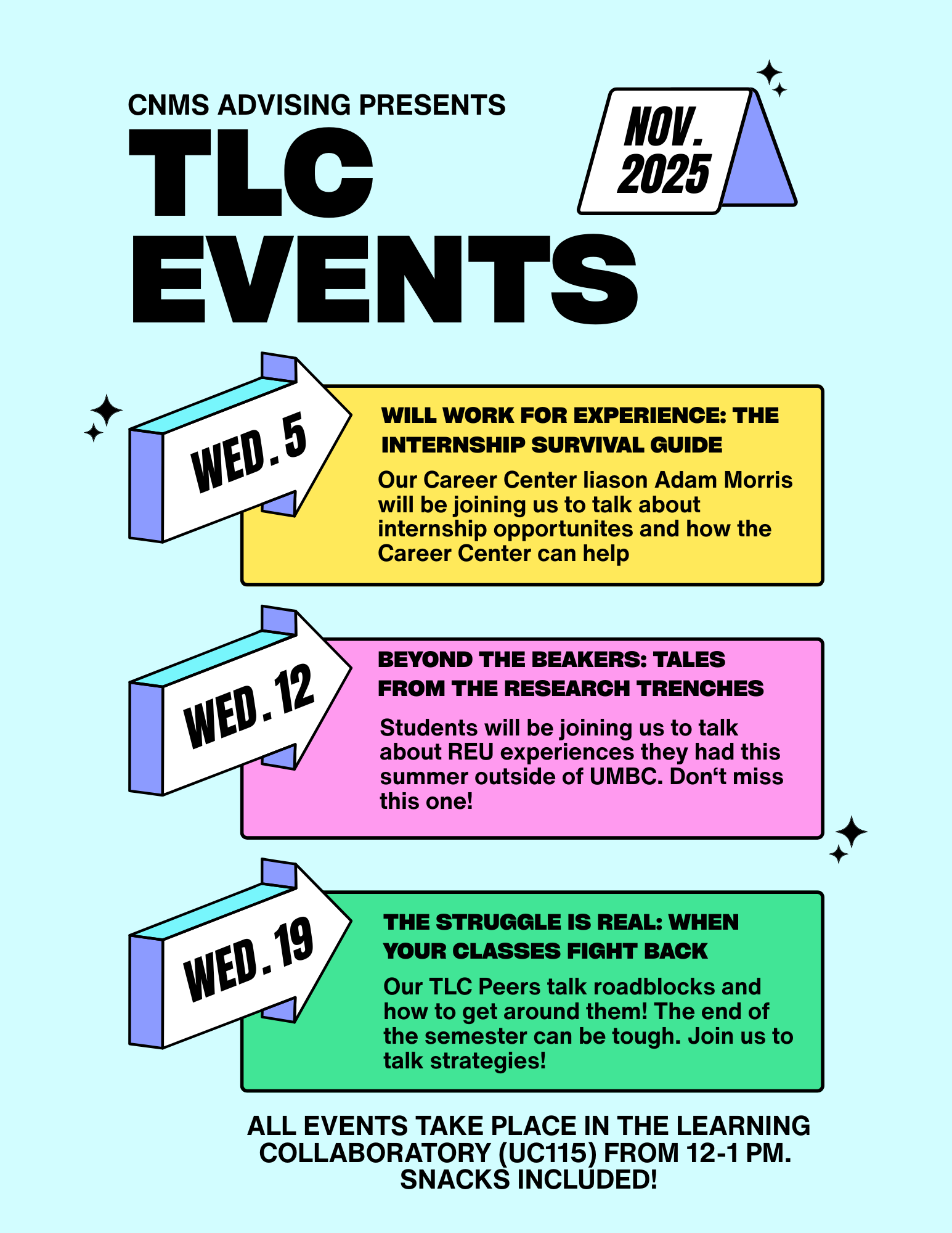All of our events during the semester take place on Wednesdays from 12-1 PM in The Learning Collaboratory (UC115). Check out our myUMBC posts! If you’re not a member, you can find the CNMS Advising myUMBC Group here.